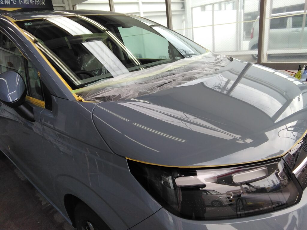 手洗い洗車後、マスキング作業をしていきます。新車でも軽研磨作業によりキッチリと下地を整えていきます。